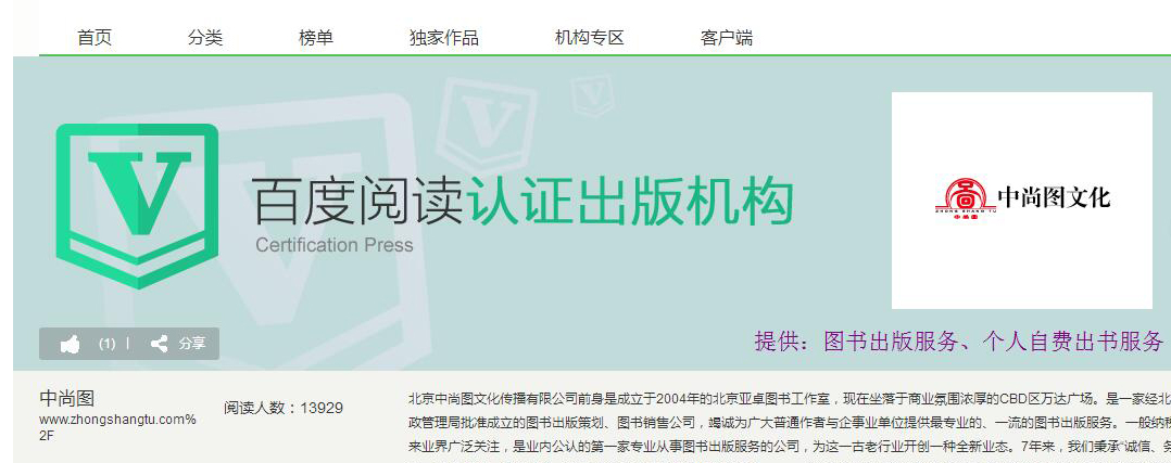 中尚圖入駐百度閱讀平臺一年,提供電子圖書閱讀服務,個人出書夢想助力,聯合眾多出版機構 共同發現你的杰作 百度閱讀提供豐富的電子圖書、暢銷書排行榜,種類包括小說、文學、傳記、