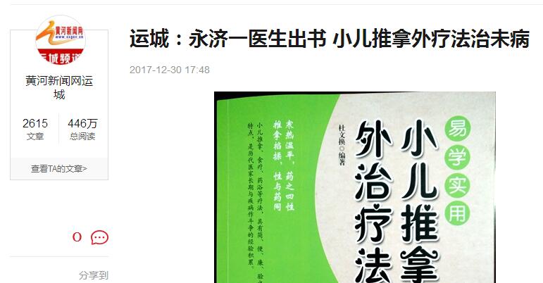 黃河新聞網(wǎng)訊:2017年12月30日,中醫(yī)兒科,源遠(yuǎn)流長,尤其是小兒推拿、藥浴、膏方外敷等治療法,幾千年來在大量的臨床實(shí)踐中,一代代兒科醫(yī)生積累了豐富的經(jīng)驗(yàn),對許多小兒疾病施治確有良效。然妙理精方陳雜于蒼茫醫(yī)林,篇幅繁多,難以類見。近日,山西永濟(jì)涑北醫(yī)院的兒科主任杜文換利用多年的臨場經(jīng)驗(yàn),不斷地總結(jié)編寫出一套治療理論《易學(xué)實(shí)用小兒推拿與外治療法》:推經(jīng)撫絡(luò),科學(xué)育兒出版現(xiàn)已上架。